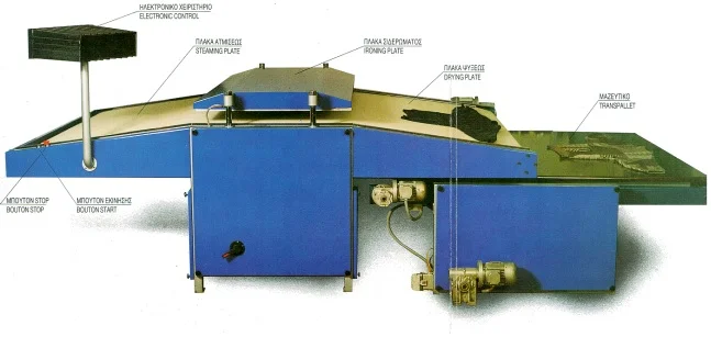 Υπεραυτόματη σιδερωτική πρέσα με συνεχή κίνηση της μεταφορικής ταινίας, με ατμό και με μαζευτικό